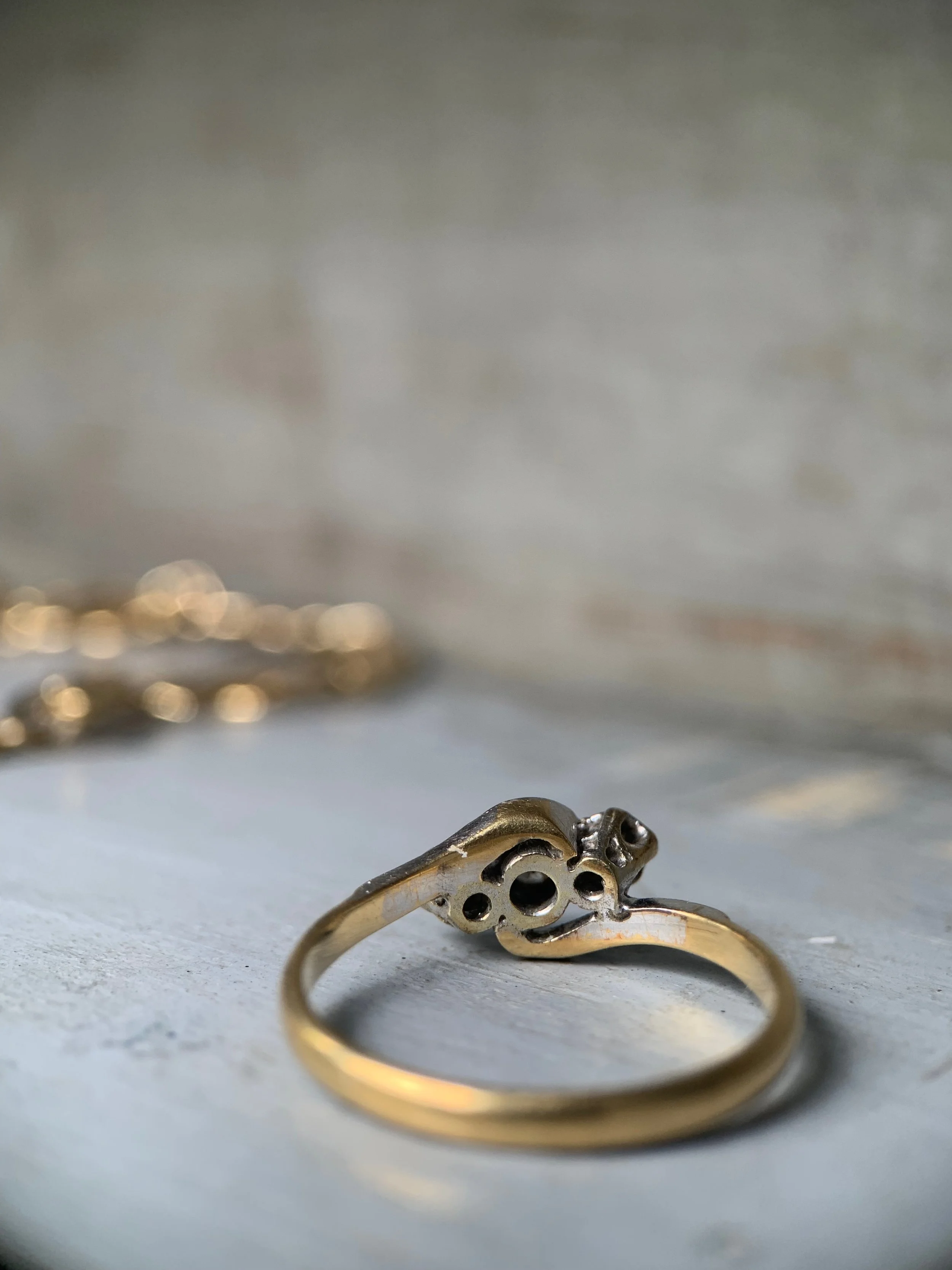 Very good condition. This ring still looks beautiful considering her age, the diamonds are secure and sparkling. There are a few minor scratches to the band but these are not at all noticeable when worn.